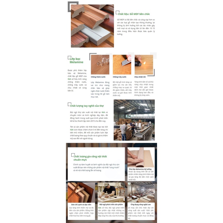 - Chất liệu: Gỗ MDF vững chãi và an toàn cho trẻ nhỏ. Được xử lý chống cong vênh và mối mọt, cũng như phủ Melamine dày dặn chống trầy xước và chống thấm nước vượt trội, dễ dàng vệ sinh lau chùi.