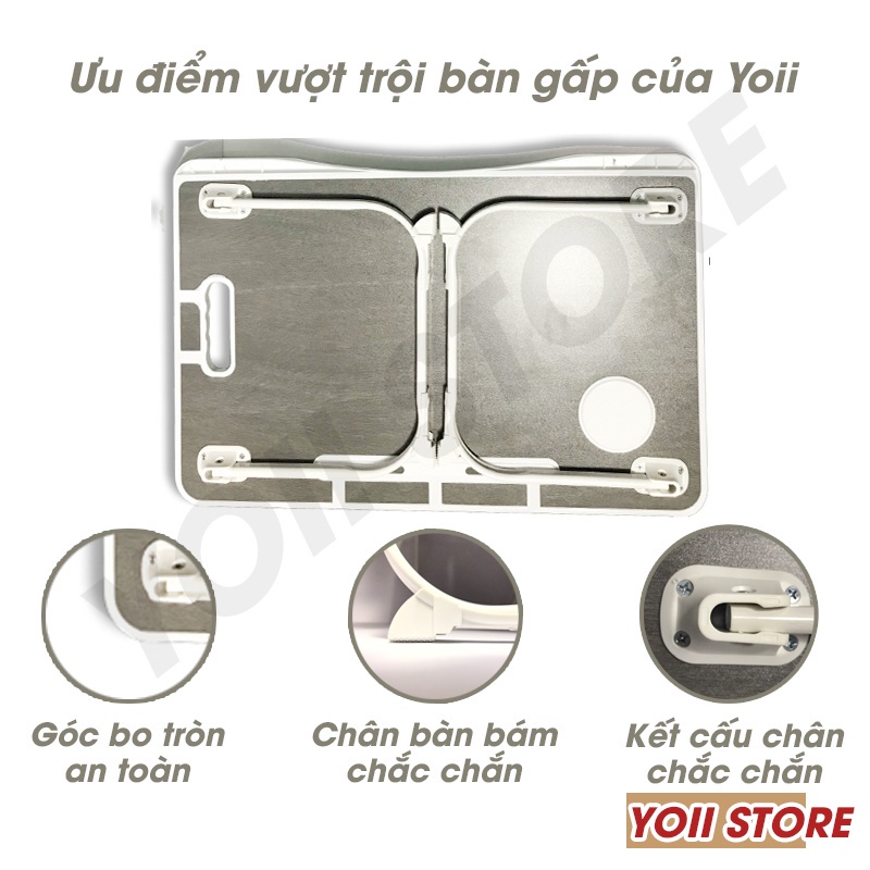 - Khác với nhiều mẫu mã khác trên thị trường, bàn gấp gọn tại Yoii Store có khe cắm iPad - rất phù hợp với nhưng người có nhu cầu học hoặc họp online trong mùa dich, 1 chỗ để cốc nước, 1 quai sách giúp dễ dàng mang di chuyển