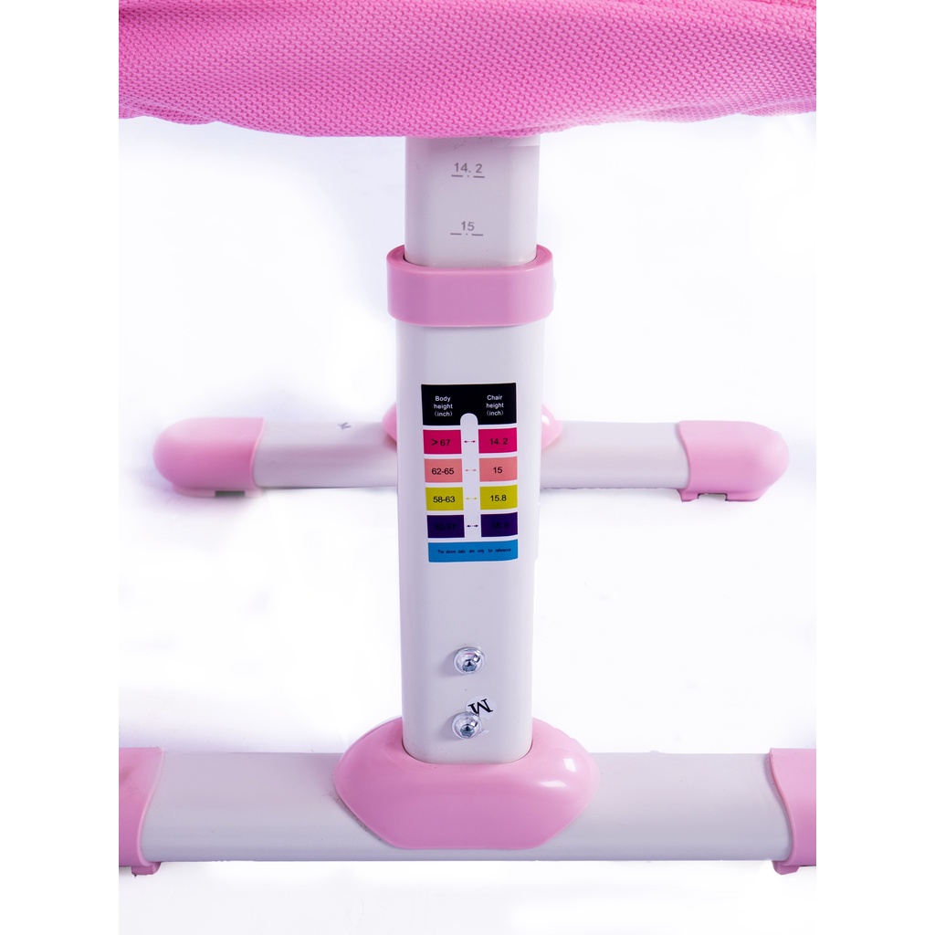 Chiều cao ghế điều chỉnh dễ dàng từ 35- 42 cm bằng núm vặn. Tính năng này giúp bé luôn có tư thế ngồi chuẩn, phòng tránh bệnh lý học đường như gù lưng, cong vẹo cột sống, cận - loạn thị.