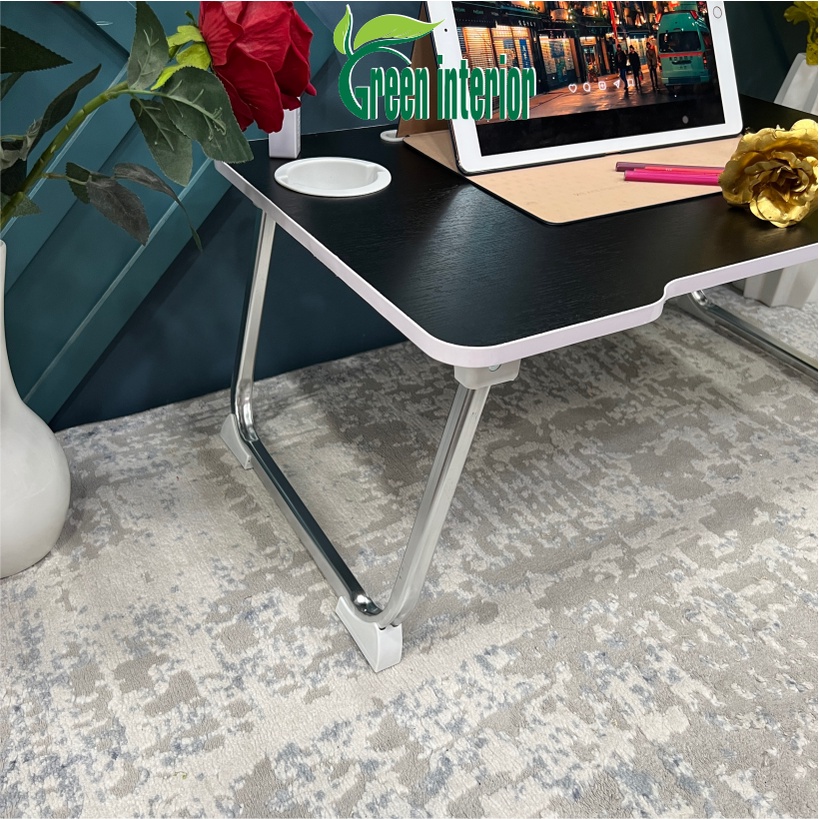 Giới thiệu Bàn học thông minh, bàn làm việc chân thép xếp gọn Green Furni có cốc để ly tiện lợi MÀU ĐEN VÂN GỖ TĐ