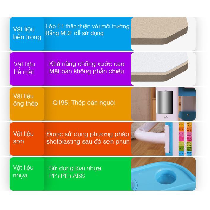 Sản phẩm cao cấp được sản xuất, thiết kế theo tiêu chuẩn Châu Âu. Bàn có nhiều tính năng thông minh như nâng hạ chiều cao bàn, thay đổi góc độ mặt bàn, tầm nhìn hợp lí cho trẻ,…Tình trạng cận thị ở trẻ xuất hiện ngày càng nhiều, đặc biệt là những thành phố lớn. Trong một lớp học 40 học sinh thì 30-32 em đã bị cận. Thấu hiểu được những việc đó, đã đưa về những bộ bàn ghế chống gù chống cận đạt tiêu chuẩn E1 với độ bền sử dụng hơn 20 năm, nhiều tính năm vượt tội. Đặc biệt phù hợp cho nhiều lứa tuổi.