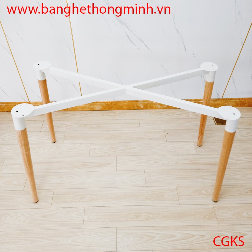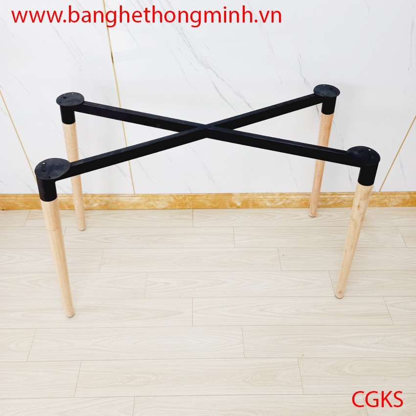 - Chân bàn gỗ cao su được phủ PU bóng, bọc màng co chống trầy + khung sắt chữ X sơn tĩnh điện và có nút chân tăng chỉnh chống trượt.