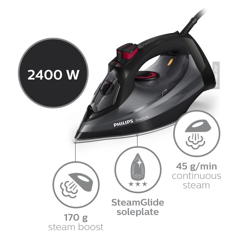 Bàn ủi hơi nước Philips GC2998 với công suất mạnh mẽ 2400W làm nóng nhanh trong 1 phút tiết kiệm thời gian chờ, mặt đế chống dính kích thước lớn hơn sẽ giúp bạn ủi phẳng mọi vết nhăn "cứng đầu".