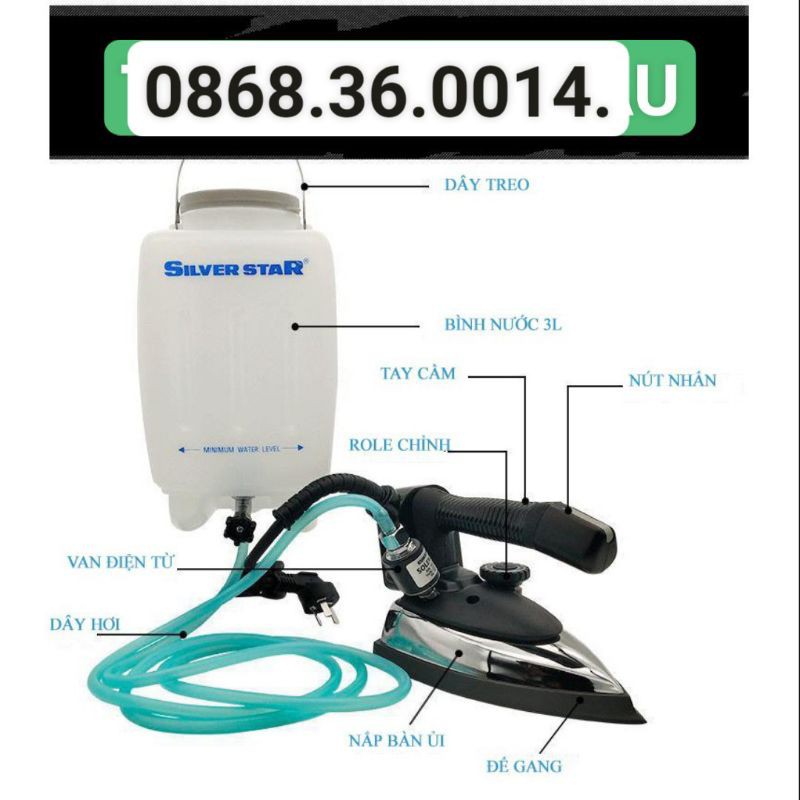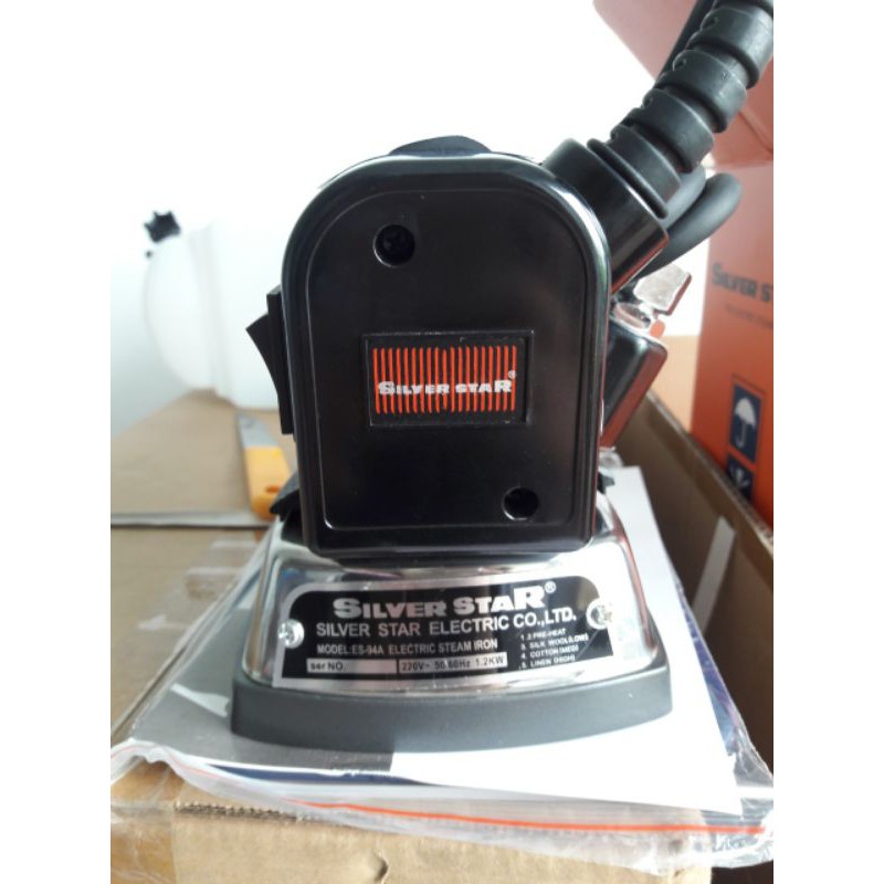 Bàn Ủi Bình Nước Treo ES-94A Silver StarModel: ES-94A Nhà SX: Silver Star TRUNG QUỐC Cân Nặng: 2,10 kg Nguồn Điện: 120/220V Áp Suất: 1200W