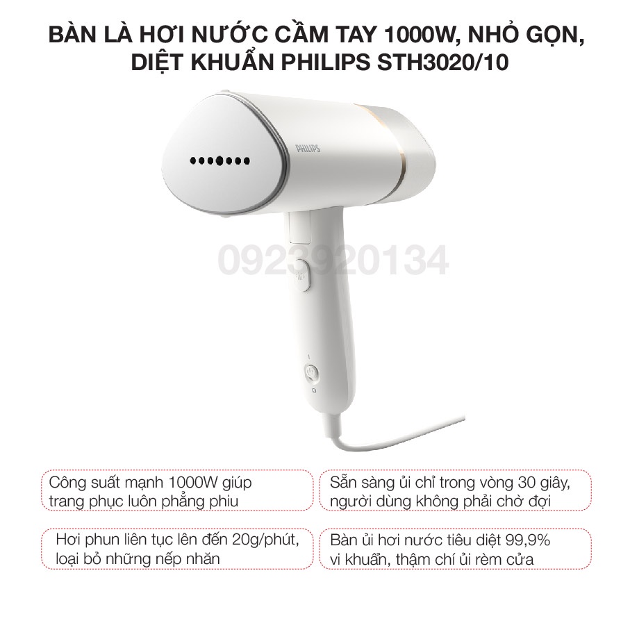 Giới thiệu [Mã 155ELSALE giảm 7% đơn 300K] Bàn là hơi nước cầm tay 1000w, nhỏ gọn, diệt khuẩn Philips STH3020/10