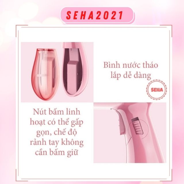 - Bàn là hơi nước cầm tay được thiết kế bình nước dễ dàng tháo nắp. Bàn ủi có nút bấm linh hoạt, có thể gập gọn, thuận tiện khi mang bàn ủi đi du lịch. Bàn ủi hơi nước có chế độ rảnh tay, không cần bấm giữ.