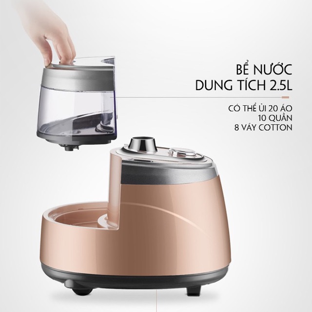 - Ngăn chứa nước có dung tích lớn 2,5L, đủ dùng cho 30 phút ủi bằng hơi nước và có thể tháo rời, dễ dàng thêm nước với lỗ châm nước lớn. Cực tích hợp có thể điều chỉnh để treo quần áo trong khi dùng bàn ủi và có thể thu gọn lại để cất giữ.