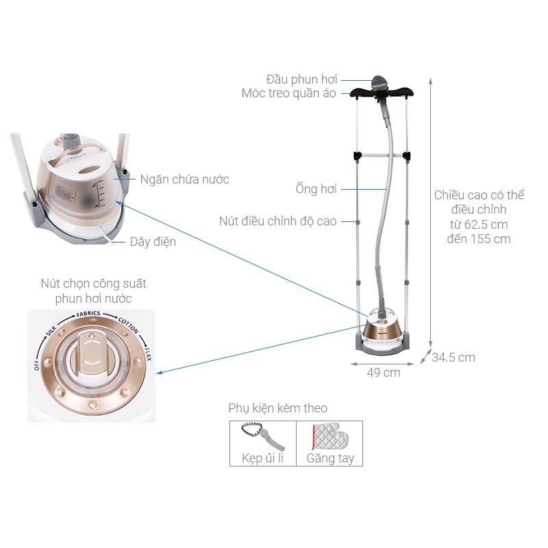 Tùy vào độ dài của quần áo, váy đầm hay khăn màn cần ủi mà bạn điều chỉnh chiều cao giá treo phù hợp, ủi đồ và cất giữ sản phẩm thuận lợi, tiết kiệm công sức, thời gian tối đa.