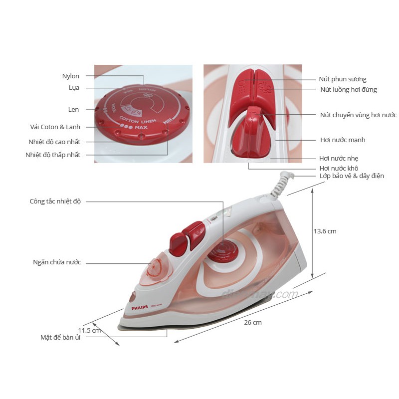 - Vòng chỉnh nhiệt sử dụng dễ dàng giúp lựa chọn nhiệt độ thích hợp cho từng loại vải một cách chính xác, đèn báo sẽ tự động khi đạt mức nhiệt cần thiết.
