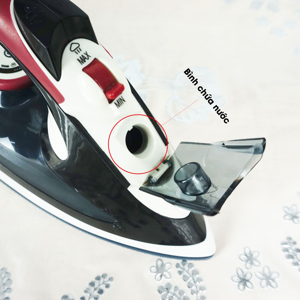 – Bàn là được thiết kế nhỏ gọn, thông minh, dễ sử dụng . Đặc biệt, bàn là có công nghệ ủi hơi nước, tia nước không chỉ giúp làm thẳng quần áo một cách dễ dàng mà còn có khả năng làm sạch các bụi bẩn bám trên quần áo, màu sắc trang nhã cũng giúp tạo nên thiện cảm cho sản phẩm này.