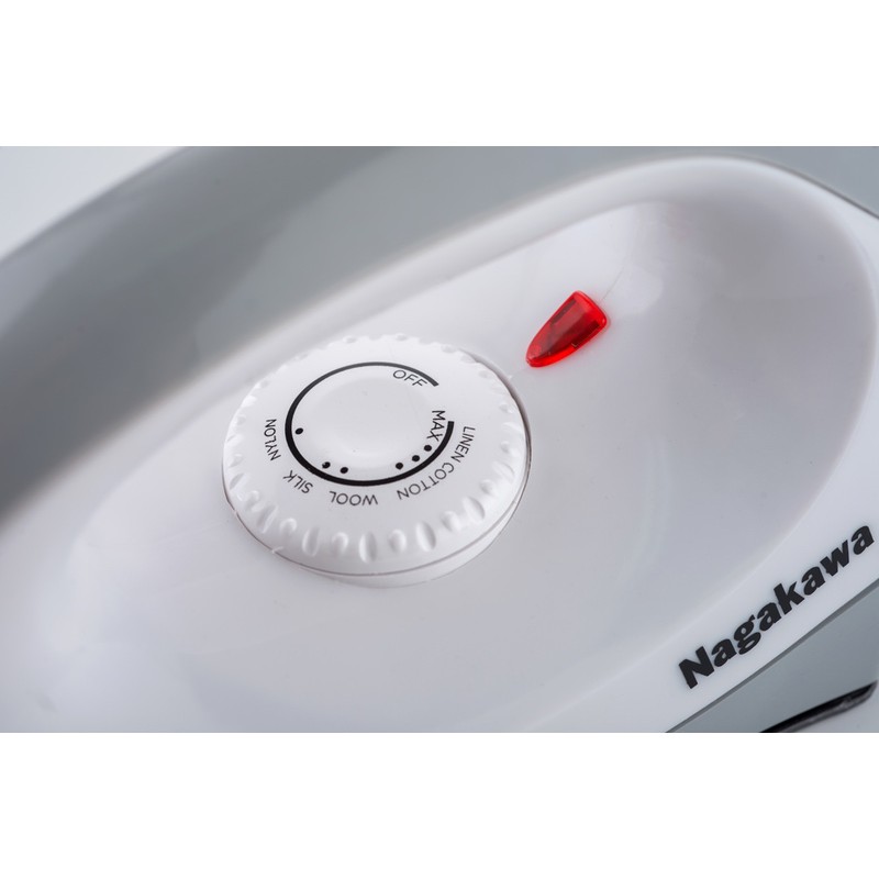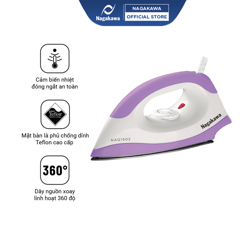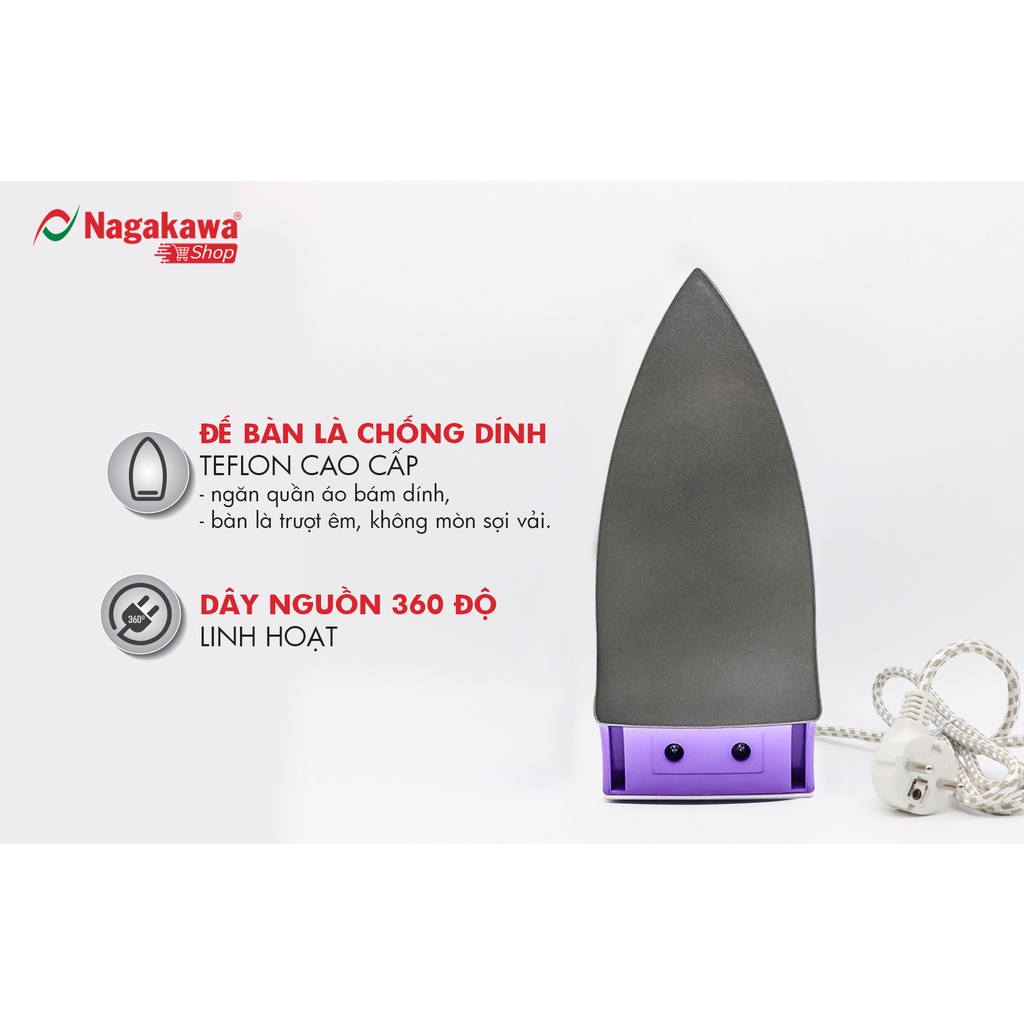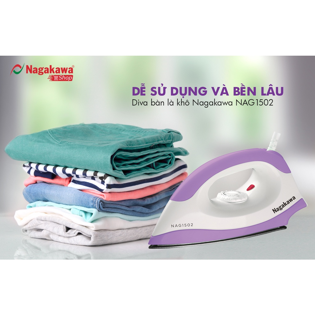- Bàn là khô Nagakawa NAG1502 với thiết kế đầu bàn là mũi nhọn giúp dễ dàng là ủi mọi vị trí trên quần áo nhất là những chỗ khó là như cổ áo, gấu áo, nếp nhăn gần cúc áo, quần và vùng nhỏ hẹp khó ủi…
