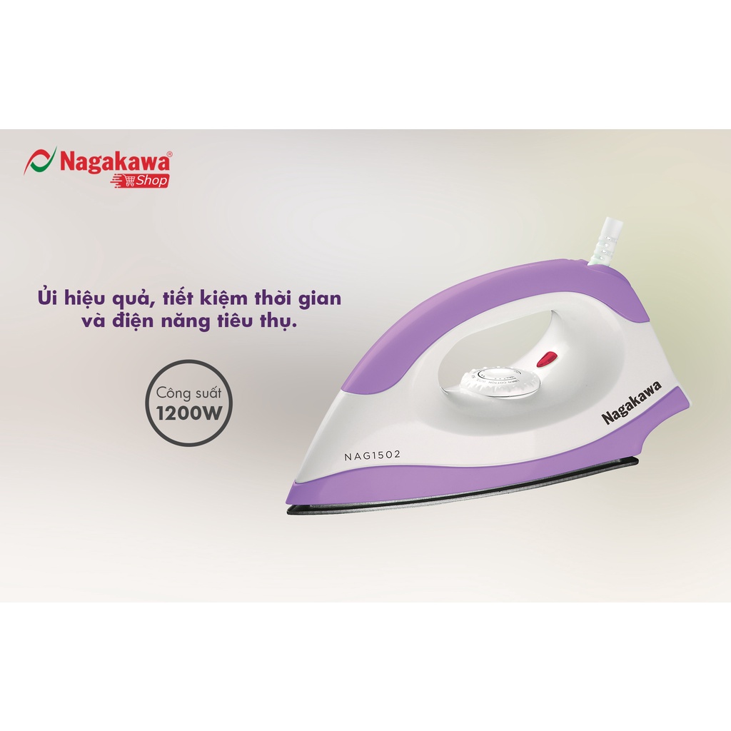- Bàn là khô Nagakawa NAG1502 hoạt động công suất 1200W cho mức nhiệt lớn, đảm bảo cho bạn ủi những loại quần áo có vải dày. Với công suất này, việc là ủi sẽ hiệu quả, tiết kiệm thời gian và điện năng tiêu thụ.