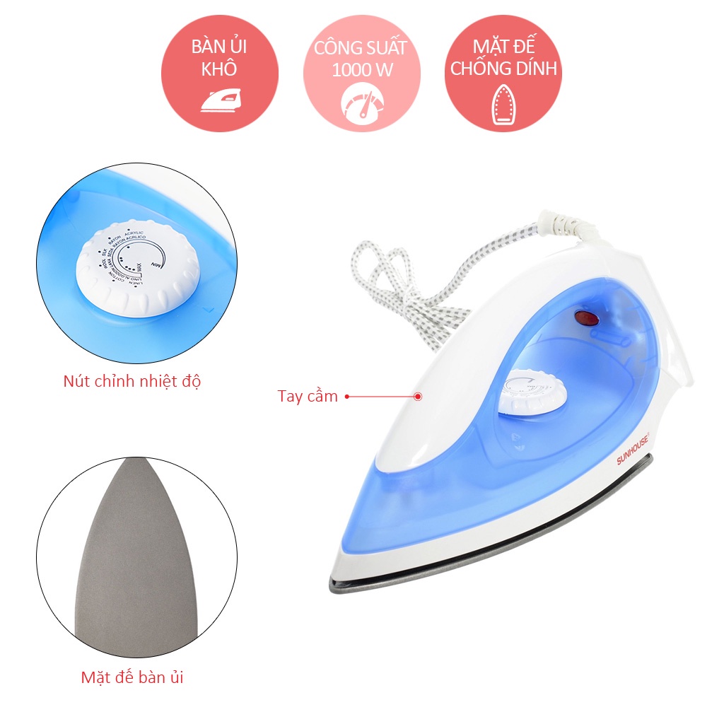 Bàn là khô Sunhouse SHD1072 Bàn ủi trượt êm trên mọi chất liệu cám biến nhiệt an toàn - HAPOS