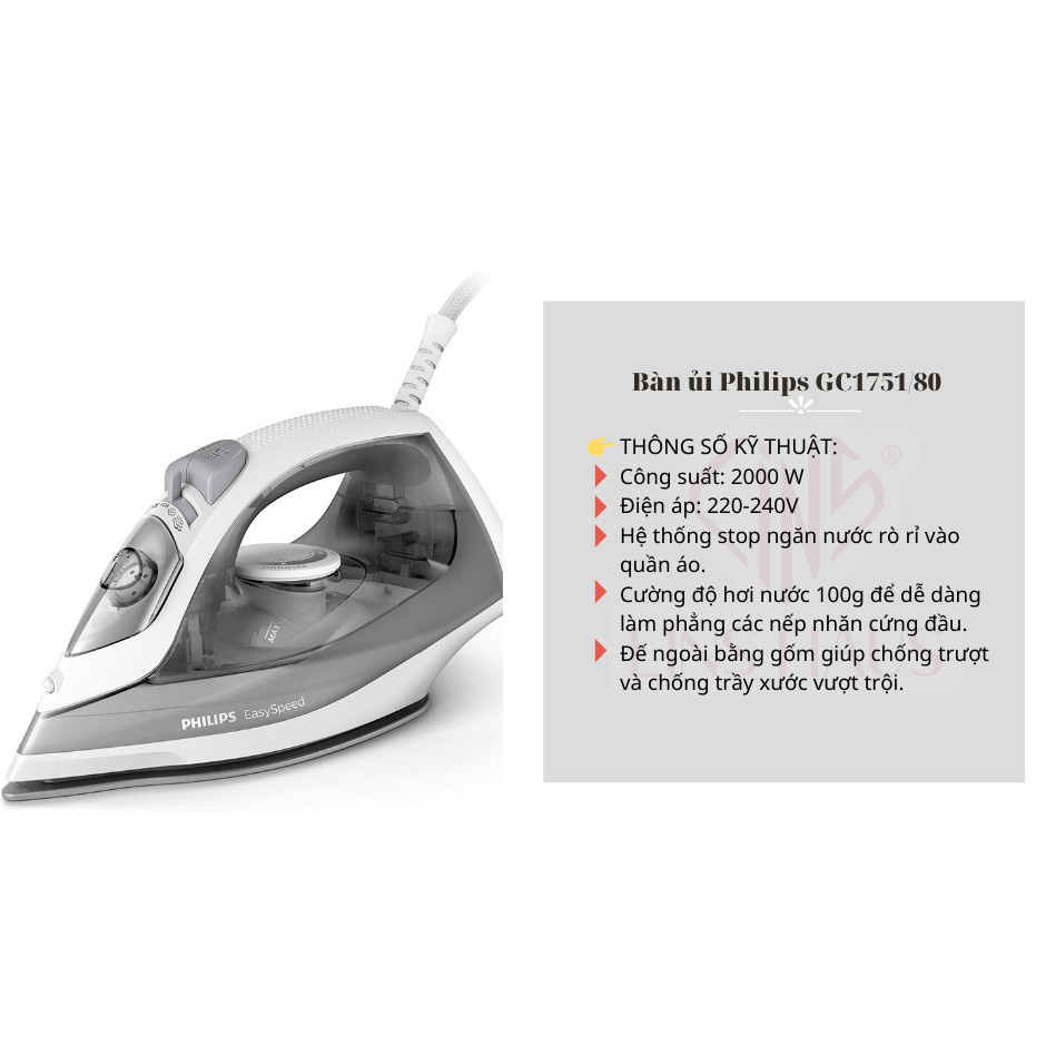 Giới thiệu Bàn là PHILIPS GC1751/80, màu ghi xám, công suất 2000W [ HÀNG CHÍNH HÃNG]