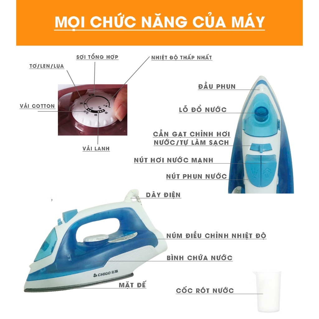 -Nhiệt độ thấp phù hợp sợi vải tổng hợp,nylon + Nhiệt độ trung bình phù hợp vải tơ,len lụa + Nhiệt độ cao phù hợp vải cotton,vải lanh (Núm điều chỉnh nhiệt độ ký hiệu theo vòng từ thấp đến cao)