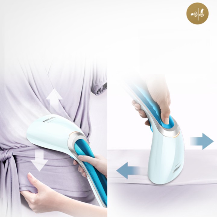 - Bàn ủi hơi nước cầm tay nhẹ và thuận tiện để sử dụng nhờ thiết kế gọn gàng và tiện dụng. Chỉ cần nhấn nút và nhanh chóng loại bỏ nếp nhăn bằng luồng hơi nước liên tục.