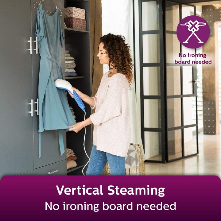 - Bàn ủi hơi nước cầm tay nhẹ và thuận tiện để sử dụng nhờ thiết kế gọn gàng và tiện dụng. Chỉ cần nhấn nút và nhanh chóng loại bỏ nếp nhăn bằng luồng hơi nước liên tục.