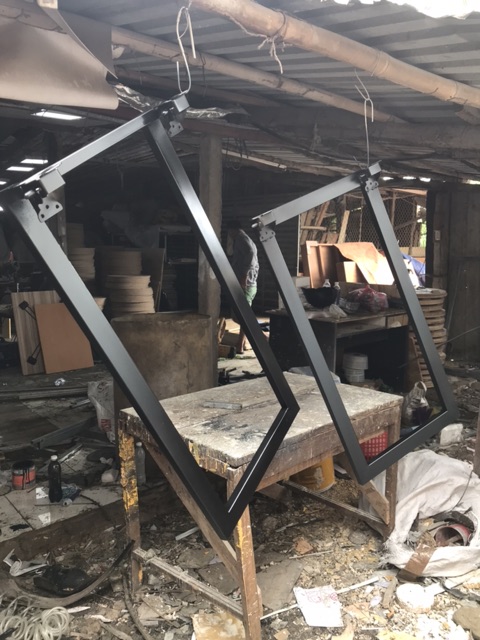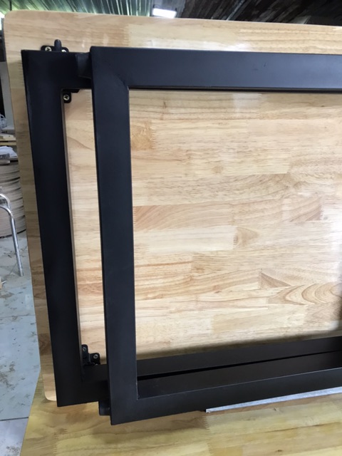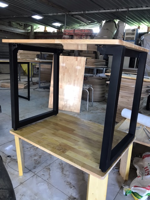 Chân bàn làm từ sắt Hộp mạ kẽm dày 1,2mm, sắt hộp Vuông 4cm, đã sơn lót và sơn phủ đen bảo vệ bề mặt của Sắtc, Chân xếp nhưng đảm bảo rất chắc, đế chân có tấm lót cao su bảo vệ bề mặt nền nhà khi tiếp xúc.
