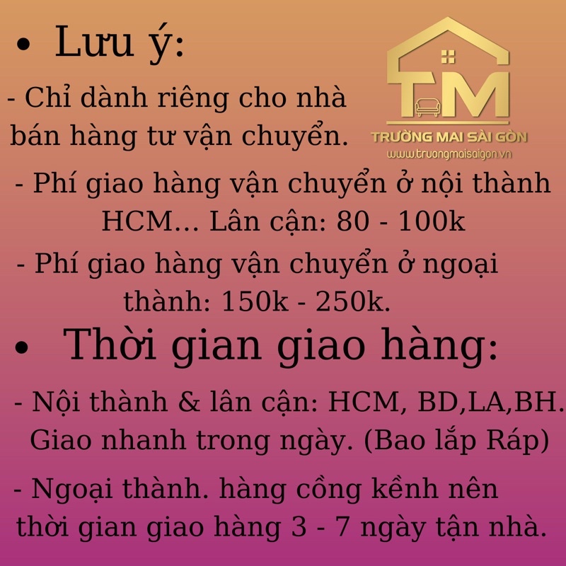 LƯU Ý : Hàng cồng kềnh để đảm bảo hàng đến tay khách hàng chuẩn đẹp không tuỳ vết. bên shop sẽ cài đặt nhà bán hàng tự vận chuyển. để đảm bảo hàng hoá được tốt nhất đến tay khách hàng.- Phí Ship: nhà bán hàng tự vận chuyển. 70 đến 100k Nội Thành.