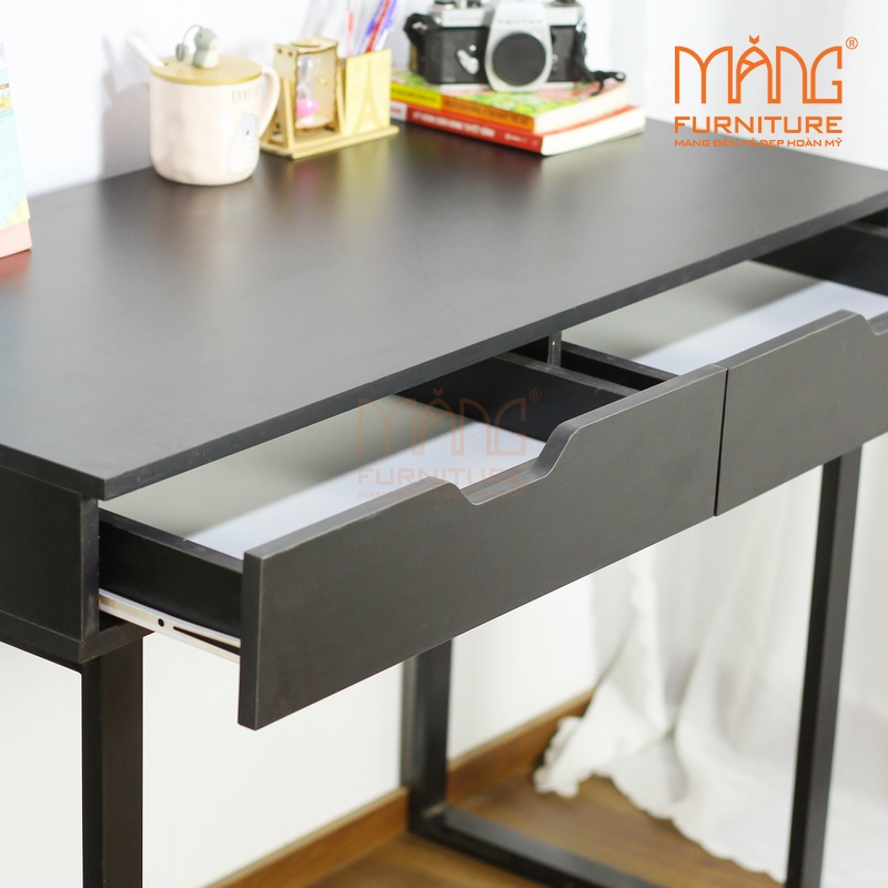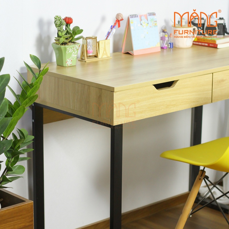 Là chiếc bàn có kèo theo 2 học kéo bên dưới mặt bàn, rất tiện dụng cho các bạn bỏ các vật dụng, đồ dùng cá nhân vào bên trong. Mẫu thiết kế tay nắm hiện đại gọn gàng được khuyết ngay trên mặt hộc kéo, tạo nên điểm nhấn cho chiếc bàn thêm sang trọng và mới lạ. Phần chân bàn được có phần bạ giằng ngang bên dưới giúp bàn không rung lắc khi sử dụng.