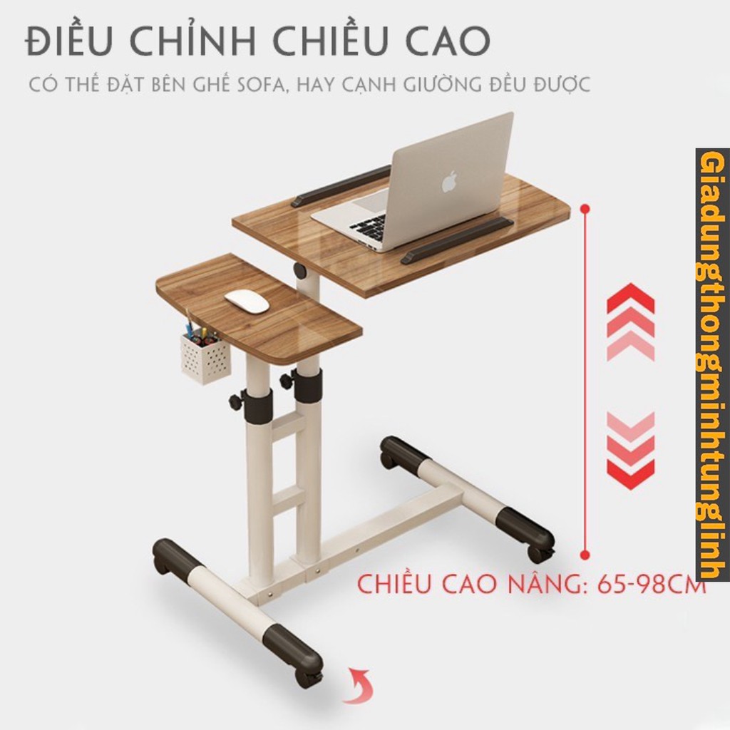 Bàn Laptop Di Động Thông Minh nâng hạ chiều cao - Mặt bàn điểu chỉnh độ nghiêng kèm giỏ bút, có bánh xe di chuyển