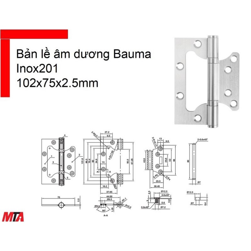 BẢN LỀ ÂM DƯƠNG BAUMA HAFELE 926.20.354 LOẠI 102X75X2.5 MM INOX 201