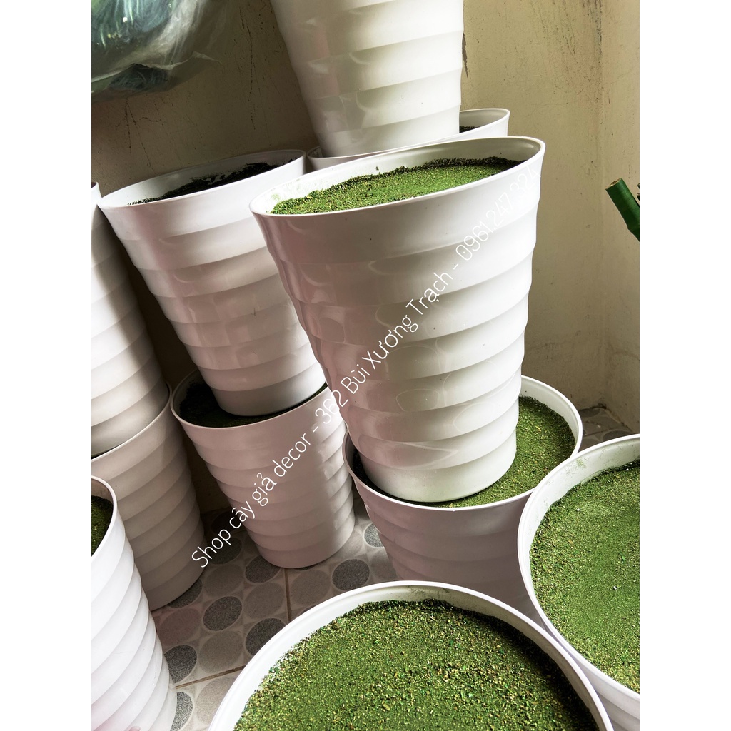 - chậu nhựa giả sứ kt 24x30cm, đã làm sẵn xốp cắm phủ rêu xanh lên bề mặt chậu (về chỉ việc cắm ko cần đất cát gì nữa)