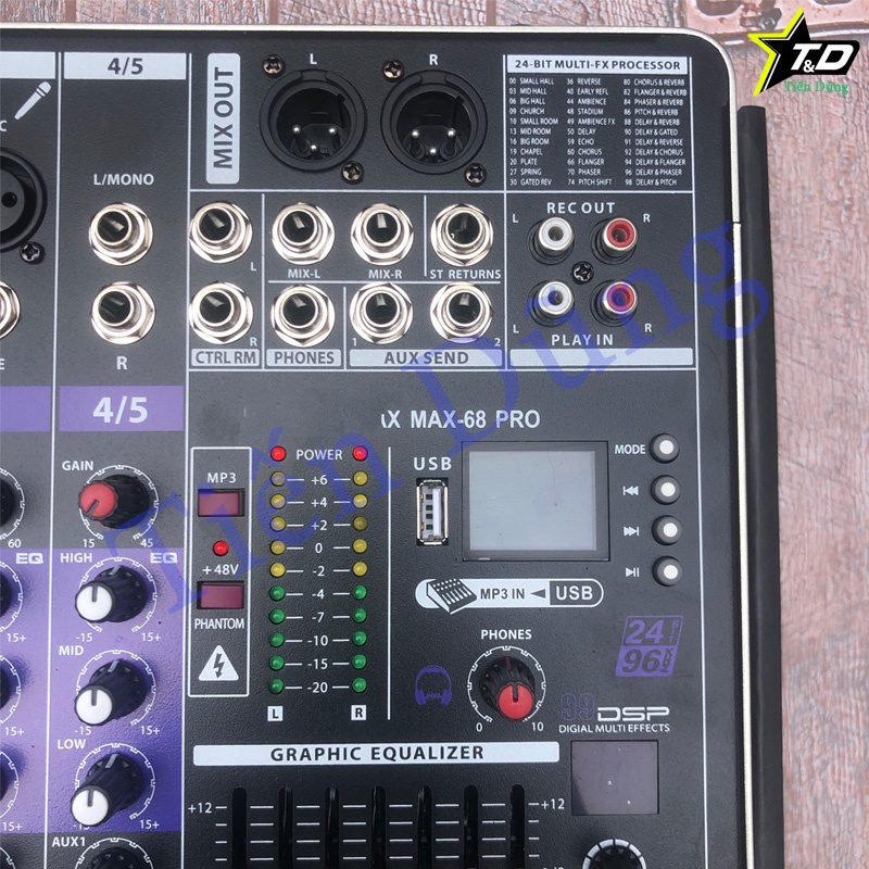 - Bộ Effect cao cấp trên Mixer MAX 68 BLUETOOTH với 99 hiệu ứng Reverb, Echo… cho tiếng ca bay bổng và mượt mà , dễ dàng tuỳ chỉnh độ ngắn dài của tiếng vang theo ý muốn. Hỗ trợ nguồn Phantom 48+V để kết nối với các loại micro condenser cao cấp dành cho phòng thu, hát livestream, bục phát biểu…