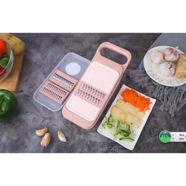Bàn nạo bào rau củ kèm hộp đựng 4 trong 1Công việc nấu nướng hằng ngày vốn dĩ đã tiêu phí của chị em rất nhiều thời gian và công sức, nhưng để làm ra những món ăn ngon và đẹp mắt còn cầu kì hơn nữa. Trong đó thì việc chế biến các loại củ quả có lẽ tốn nhiều thời gian nhất: gọt vỏ, cắt, thái, rửa,...