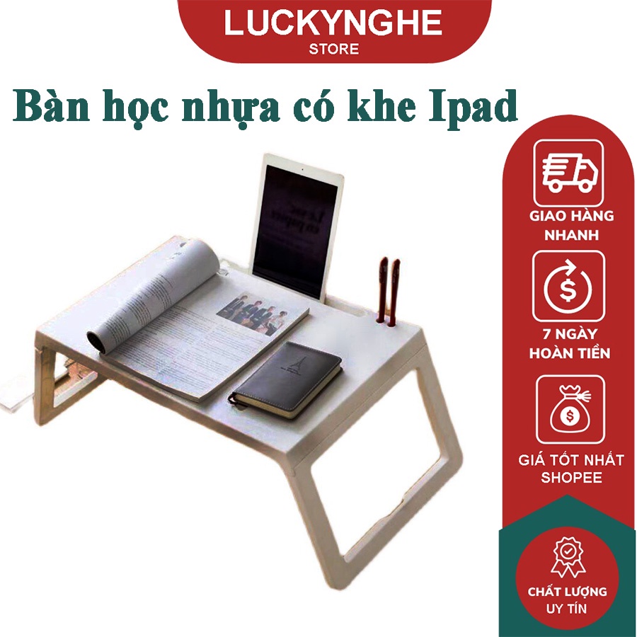- Ngoài ra với thiết kế hiện đại nên bàn nhựa gấp gọn còn có khe cắm ipad, đựng bút bi tiện lợi, giúp cho khách hàng vừa có thể học tập vừa giải trí một cách hiệu quả mà không cần phải cầm nắm, hay giữ đứng điện thoại.
