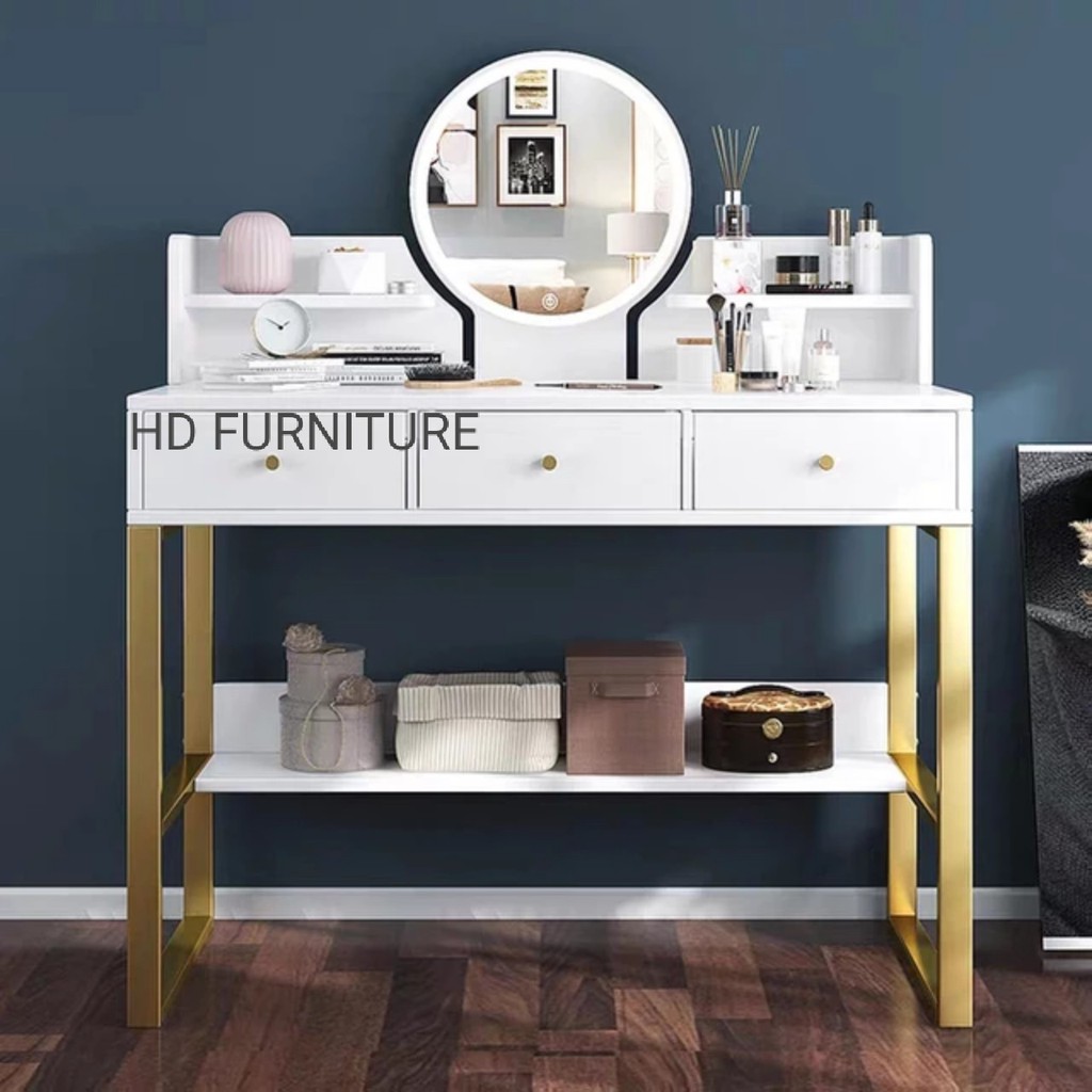 thông tin sản phẩm: ( chưa kèm ghế và gương led)- Chất liệu: Mặt bàn gỗ MDF phủ melamine chống trầy xước mối mọt. Chân kẽm phun tĩnh điện bên trong, bên ngoài mạ vàng chống bong tróc và rỉ sét