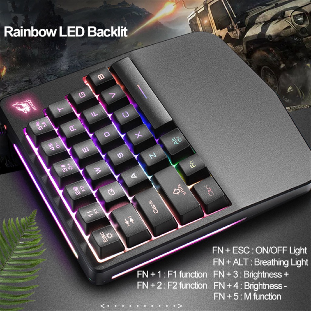 Thông số sản phẩm: Nhãn hiệu: Free Wolf (Digital) Model: K11 Bàn phím một tay Số phím: 28 (phím) Giao diện: USB Cắm và Chạy: Hỗ trợ Kết nối với máy tính: Phím chức năng Đa phương tiện có dây: Có Phím tắt: Có Tay giữ: Không Chức năng chống thấm nước: hỗ trợ không thấm nước đèn nền chức năng: bảy- màu đèn nền ergonomics: hỗ trợ vật liệu: abs kích thước sản phẩm: khoảng 185 * 155 * 28mm / 7.28 * 6.1 * 1.1in đầy đủ n- chính rollover: hỗ trợ phương pháp truyền: hạn chế usb sản phẩm keycap: laser khắc nhân vật glow Phím cuộc sống: khoảng 50 triệu lần Cung cấp điện áp: 5v ± 0.25v Chiều dài cáp sản phẩm: khoảng 1,2 mét Làm việc hiện tại: <200MA Hệ thống tương thích: cửa sổ / Mac OSX💥 Tên sản phẩm: Bàn phím bán cơ một tay FREE WOLF K11 với 28 phím Chơi game trên điện thoại,Laptop,máy tính bảng -dc3155