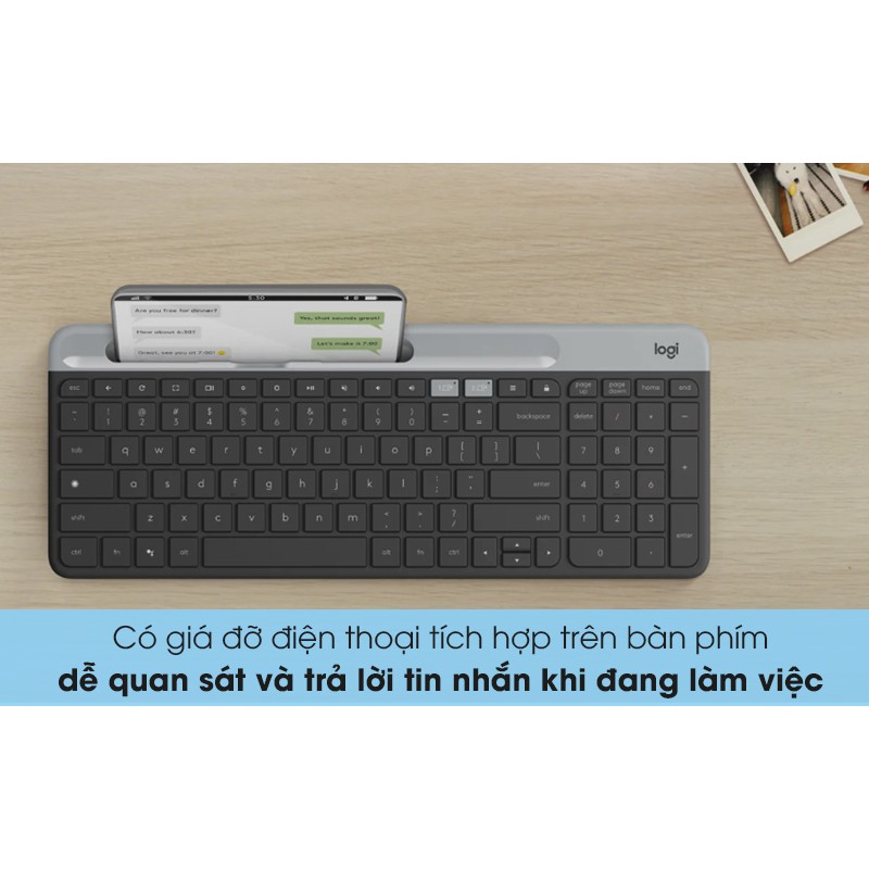 Bàn phím K580 có thể làm việc cùng lúc với điện thoại và máy tính bảng của bạn. Nút bấm Easy Switch giúp bạn chuyển đổi giữa 2 thiết bị. Bạn có thể gõ báo cáo trên máy tính rồi chuyển qua nhắn tin trên điện thoại mà bạn đặt ngay trên khe đỡ của bàn phím. THẬT TUYỆT VỜI!!!