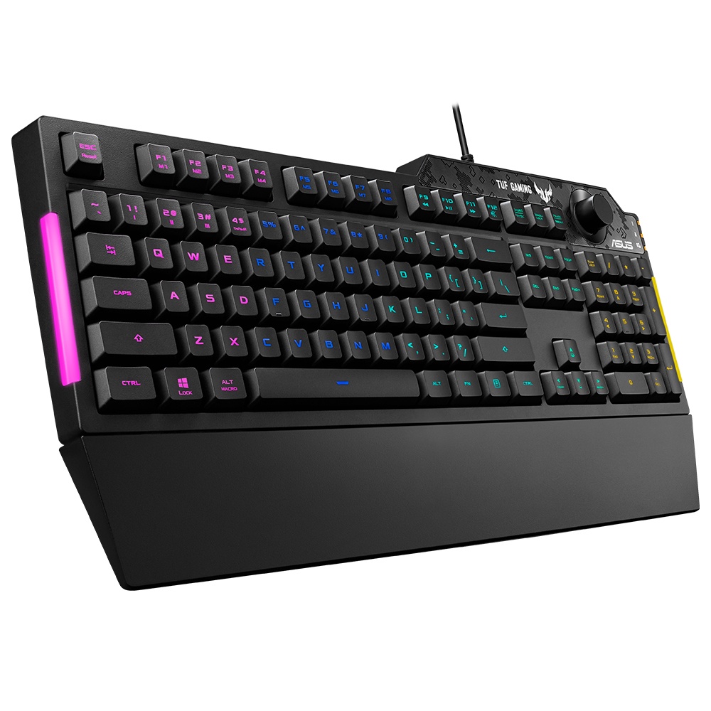 Bàn phím ASUS TUF Gaming K1 RGB với núm chỉnh âm lượng chuyên dụng, chống thấm nước, thanh đèn cạnh bên và Armoury Crate.Các phím bấm của TUF Gaming với khả năng ghi nhận 19 lần bấm cùng lúc để mang lại hiệu năng nhanh nhạy, đáng tin cậy.