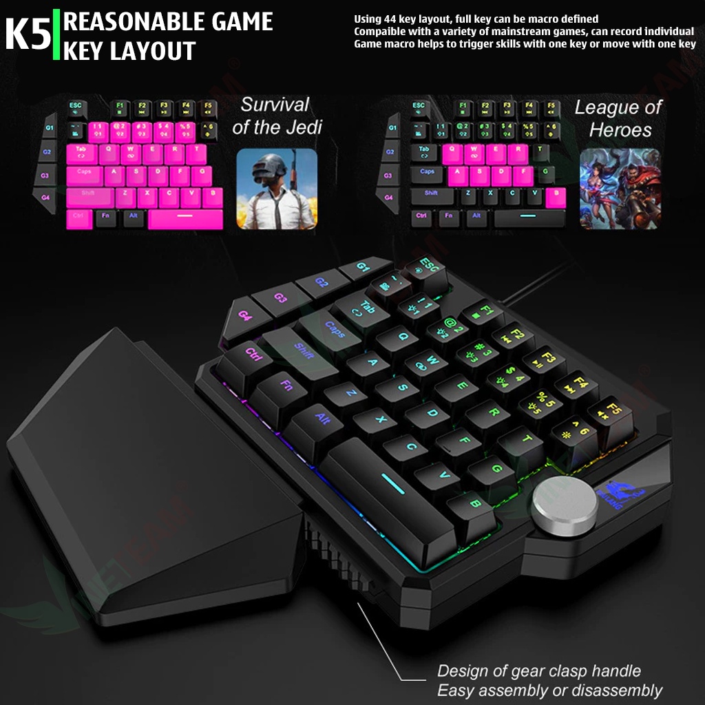 Bàn phím cơ 1 tay ZIYOULANG K5 Được thiết kế một tay với phần bố trí vị trí phù hợp cho sự di chuyển linh hoạt. Tạo điều kiện thuận tiện cho bạn chơi thoải mái với các game hot nhất thị trường.