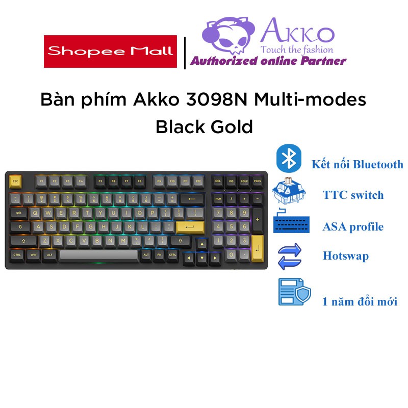 Máy tính & Laptop > Chuột & Bàn Phím > Bàn Phím Máy Tính || Bàn phím cơ AKKO 3098N Multi-modes Black Gold (Bluetooth 5.0 / Wireless 2.4Ghz / Hotswap / Foam tiêu âm / Foam đáy / TTCCòn hàng