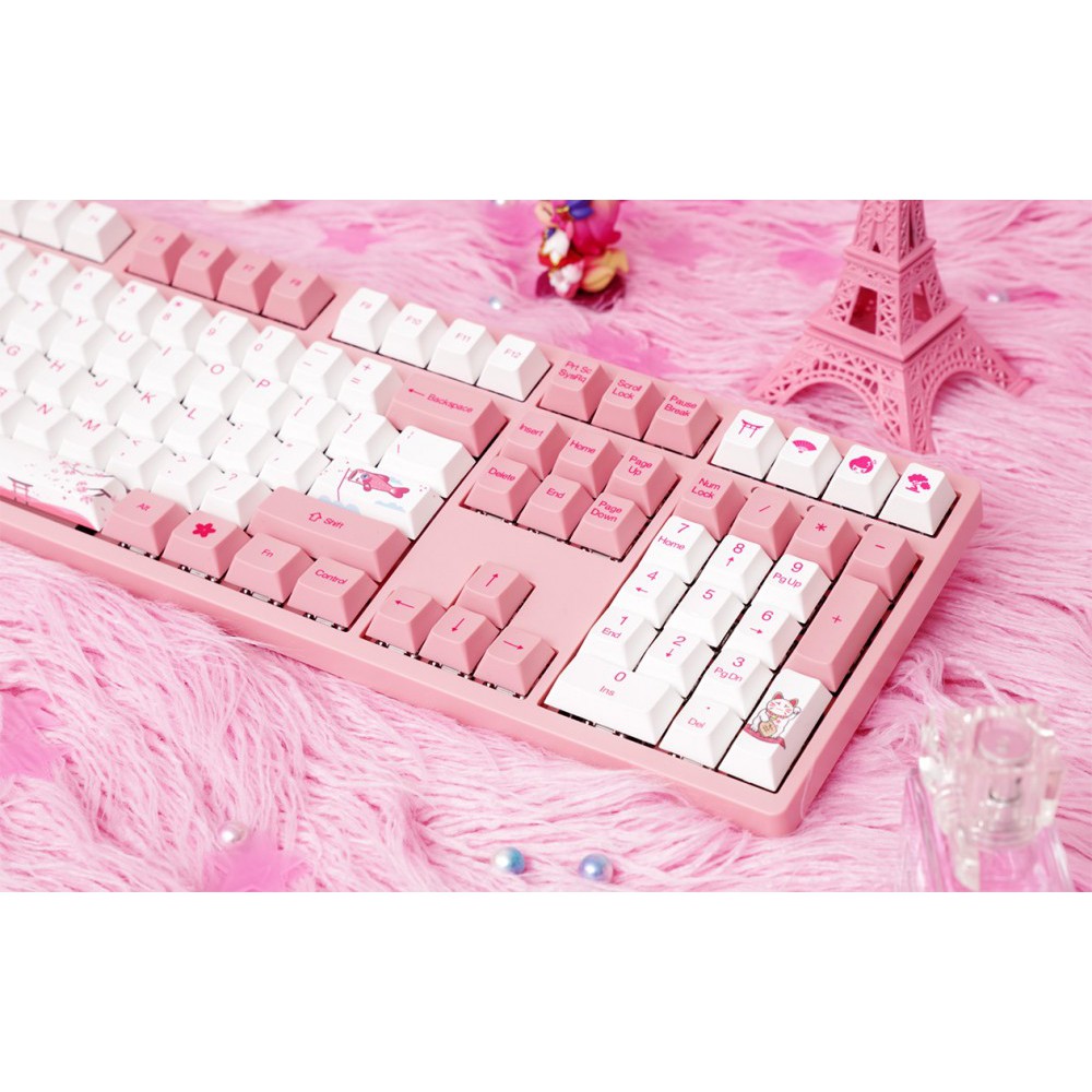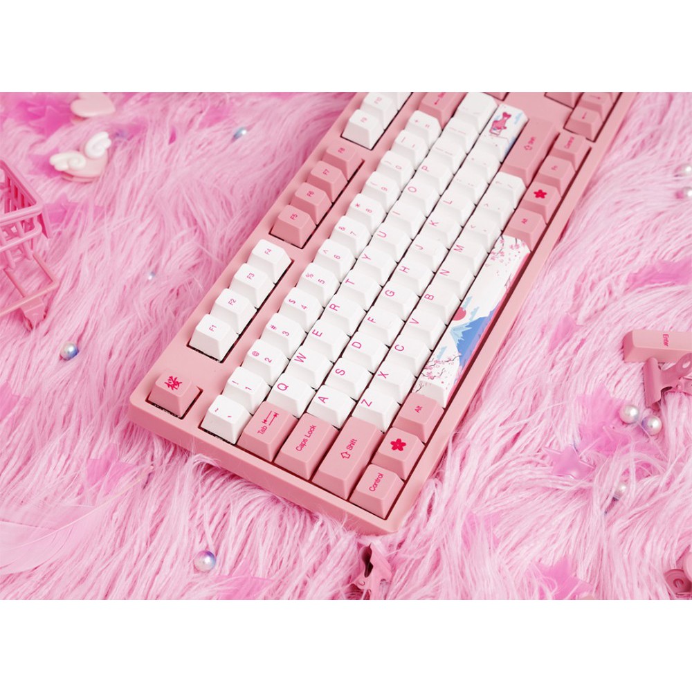 ☼ Keycap custom lấy chủ đạo là màu hồng trắng cùng hoa anh đào, núi Phú sĩ, cá chép và mèo may mắn (biểu tượng của Nhật Bản)