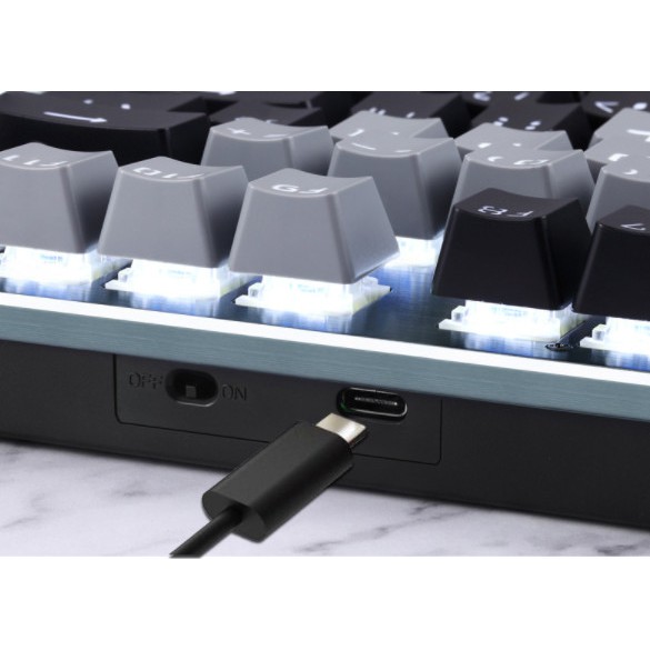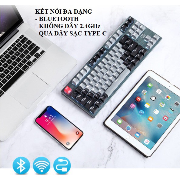 Bàn phím cơ, bàn phím máy tính có 3 chế độ kết nối để sử dụng: Bluetooth; không dây qua cổng thu usb 2.4ghz đi kèm; kết nối có dây qua dây sạc đi kèm