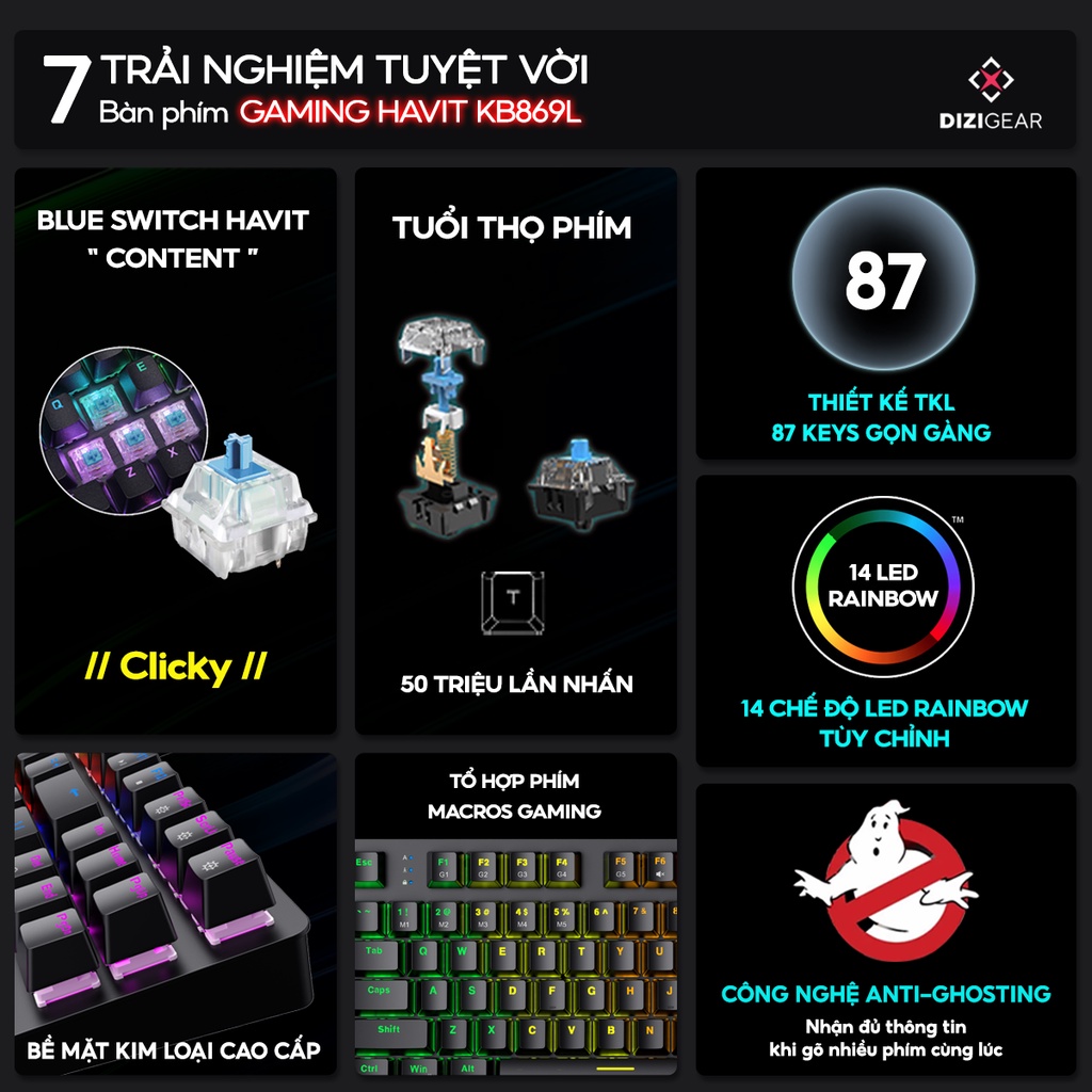 Giới thiệu Bàn Phím Cơ Gaming HAVIT KB869L, 87 Phím, 14 Chế Độ Led Rainbow - Chính Hãng BH 12 Tháng Dizigear