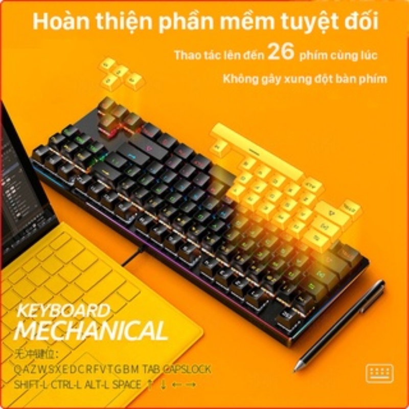 - Bàn phím cơ gaming sử dụng vật liệu nhiệt dẻo ABS có chất lượng cao, tạo cảm giác thoải mái và có độ bền và độ bền cao, rất bền để sử dụng lâu dài.