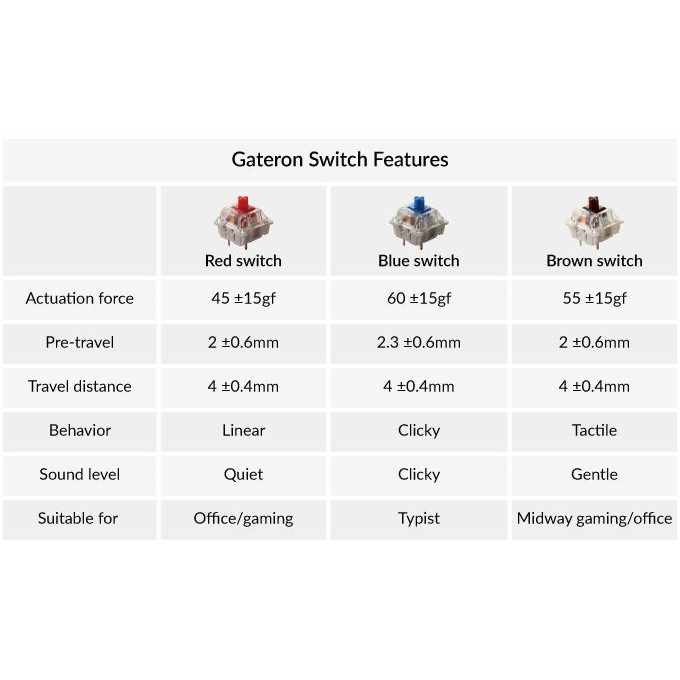 Gateron Switch với phiên bản Red, Blue và Brown.