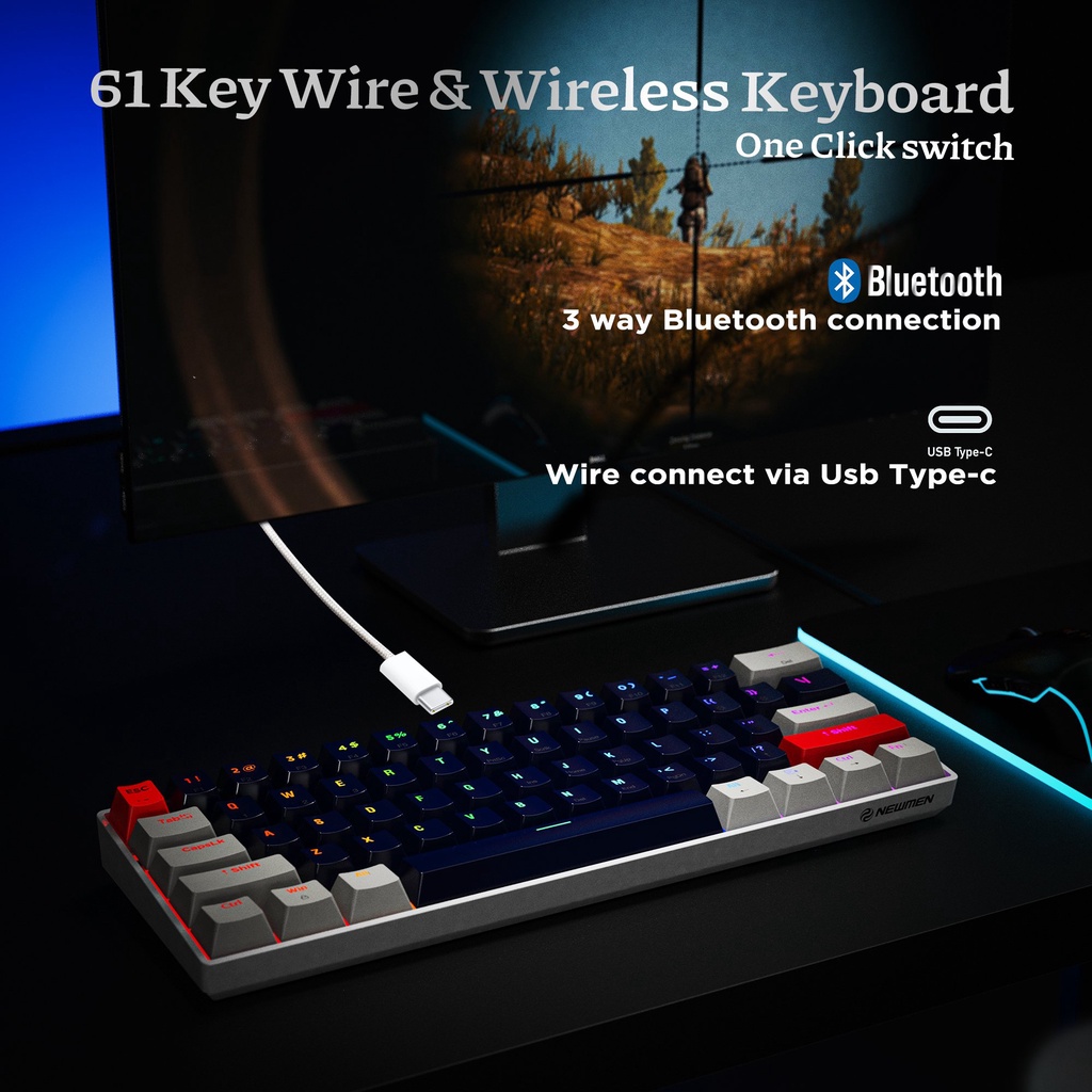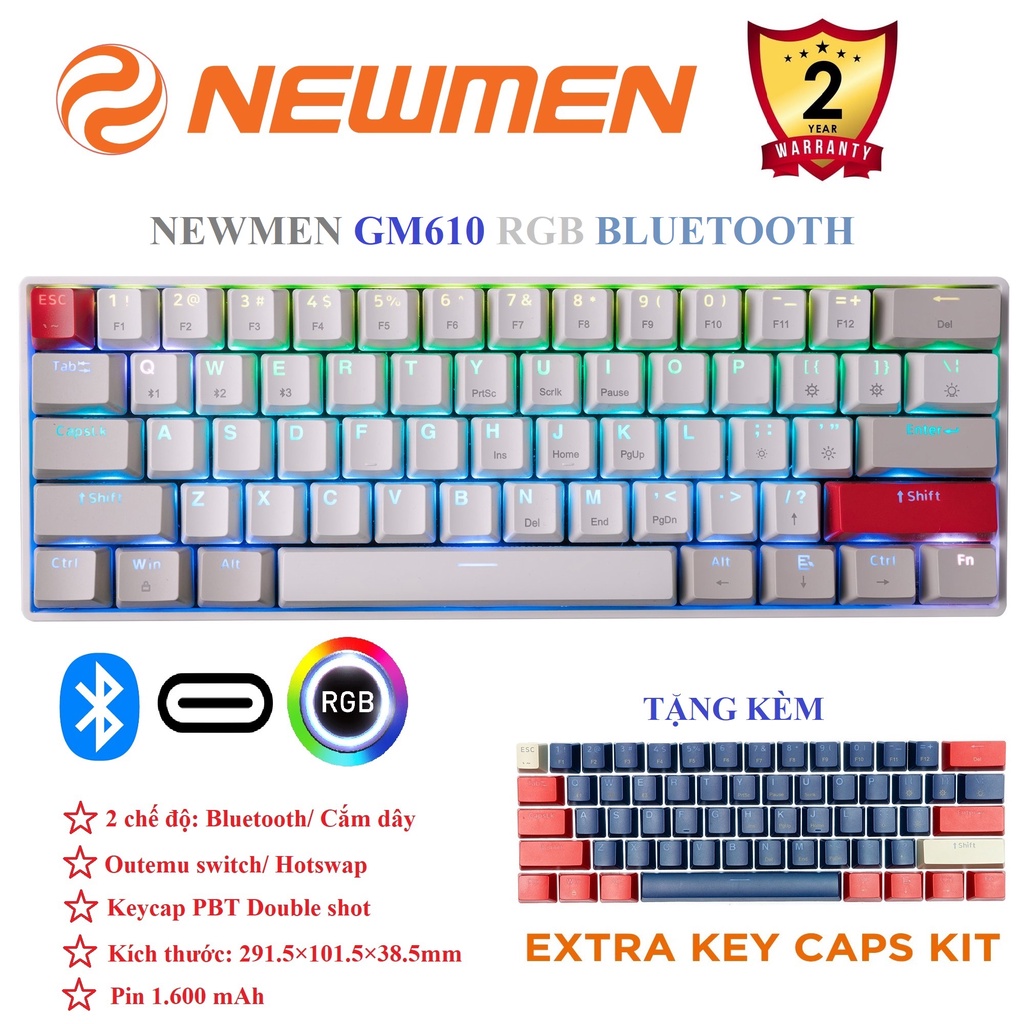 Máy tính & Laptop > Chuột & Bàn Phím > Bàn Phím Máy Tính || Bàn phím cơ không dây Newmen GM610 led RGB/ Bluetooth / dây USB type C rời - Hàng chính hãngCòn hàng