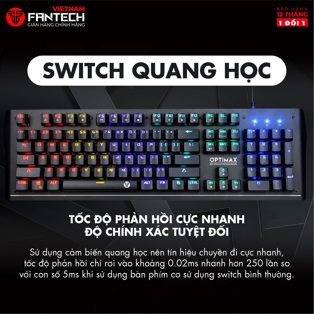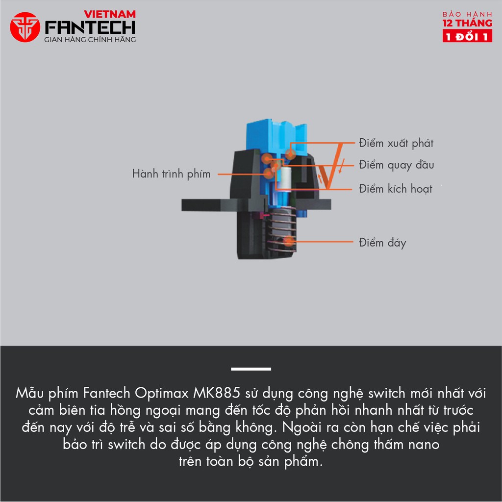FANTECH MK885 sử dụng cảm biến quang học nên tín hiệu chuyền đi cực nhanh, tốc độ phản hồi chỉ rơi vào khoảng 0.02ms nhanh hơn 250 lần so với con số 5ms khi sử dụng bàn phím cơ sử dụng switch bình thường.