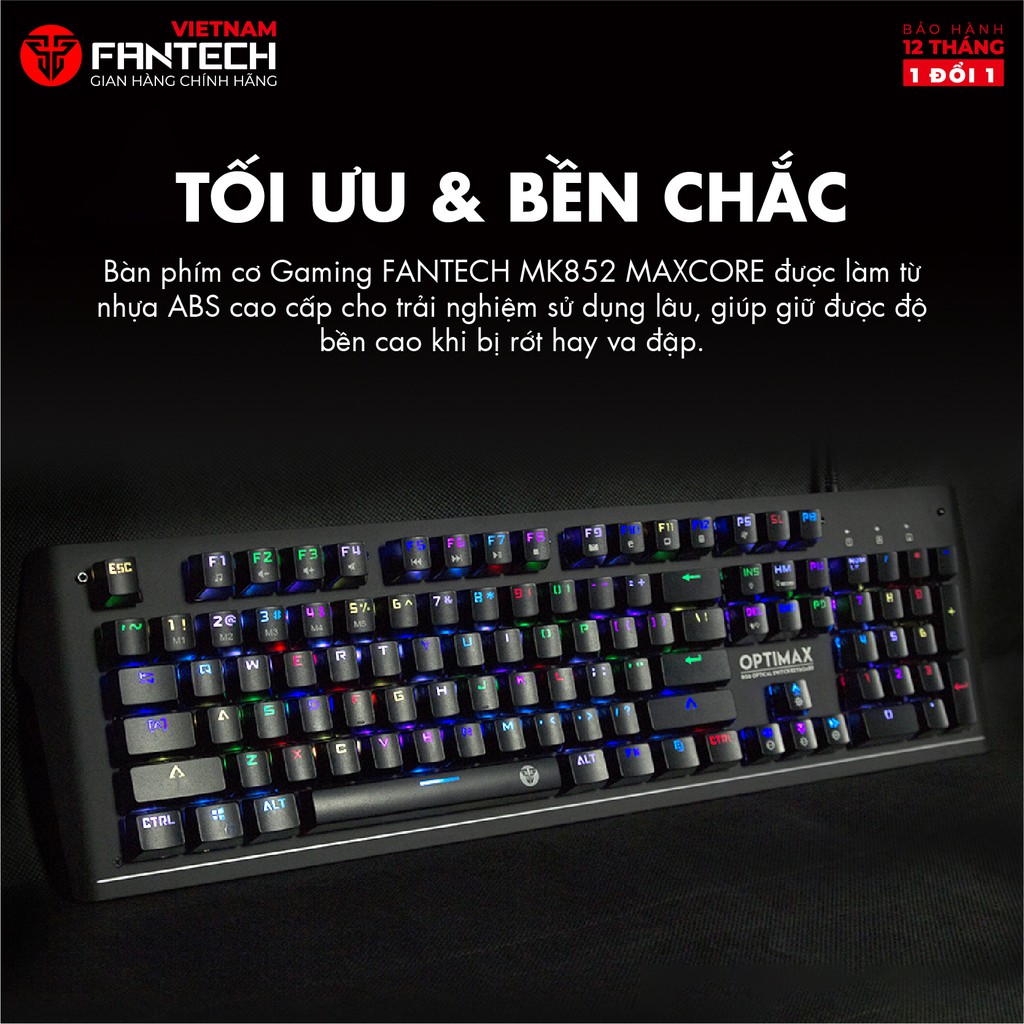 Bàn phím cơ Gaming FANTECH MK852 MAXCORE được làm bằng nhựa ABS cao cấp cho trải nghiệm sử dụng lâu, giúp giữ được độ bền cao khi bị rớt hay va đập.