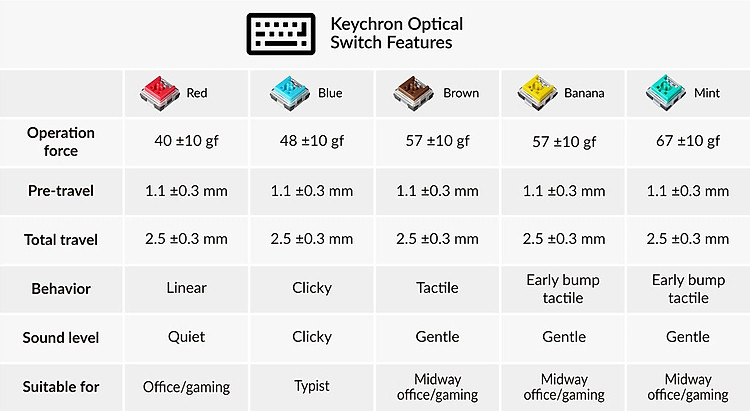 Với thân máy kiểu MX và độ trễ cực thấp 0,2 ms, các công tắc kích hoạt bằng ánh sáng này được chế tạo cho những người đánh máy hoặc game thủ muốn nhập với tốc độ cực nhanh với tuổi thọ 70 triệu lớn hơn nhiều so với tiêu chuẩn công nghiệp.