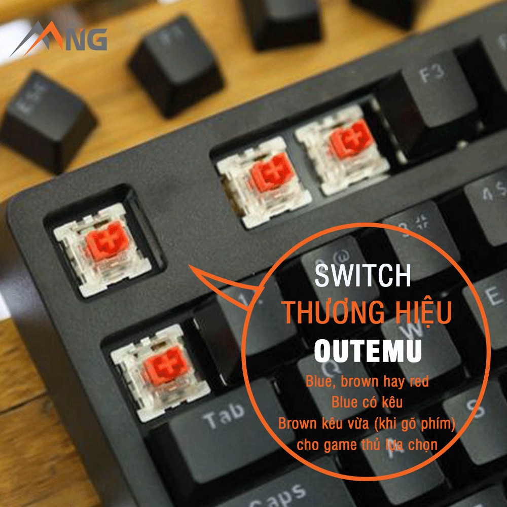 - EK387 có 3 switch cơ bản: Blue có kêu, brown kêu vừa (khi gõ phím) cho game thủ lựa chọn.