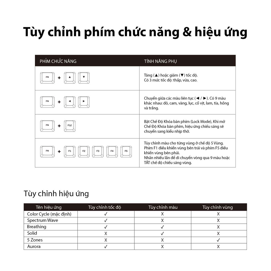Màu sắc rực rỡ cùng với sáu cấu hình hiệu ứng; Color Cycle, Spectrum Wave, Breathing, Solid, 5 Zones và Aurora.