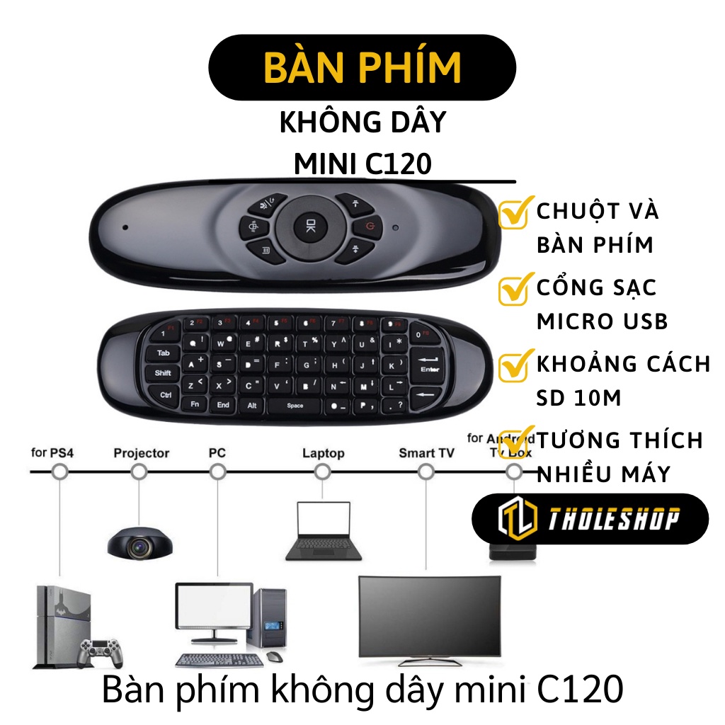 - Bàn phím mini C120 là thiết bị tích hợp gồm: Chuột bay + Bàn phím không dây + Điều khiển từ xa. Thiết bị này rất phù hợp và tiện lợi cho việc điều khiển và sử dụng Smart TV hoặc Android TV Box. Bàn phím mini C120 vừa là bàn phím không dây mini vừa có thể biến nó thành một con chuột cảm ứng chuyển động, tương tự với chiếc controller của hệ máy chơi game Wii đình đám.