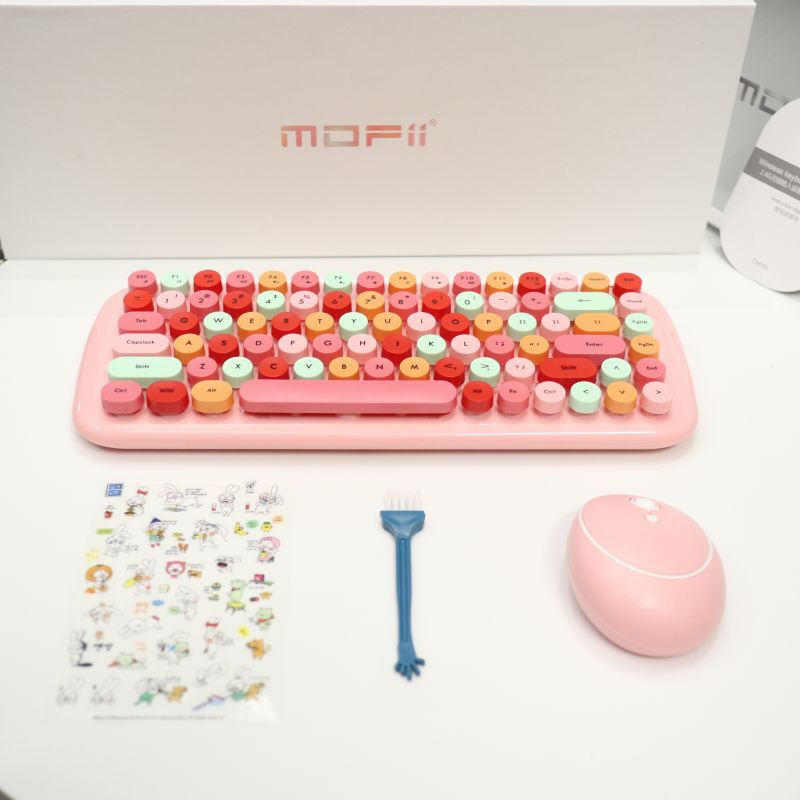✔️ Bộ Bàn Phím Chuột Tròn Giả Cơ Không Dây Candy Mofii Dễ Thương - Tặng kèm stickers + cây chổi quét bàn phím✔️ Thiết kế của bộ bàn phím cực kì đáng yêu, các phím được phối theo tone màu hồng chắc chắn sẽ làm nổi bật và mang lại màu sắc mới cho góc học tập làm việc của bạn