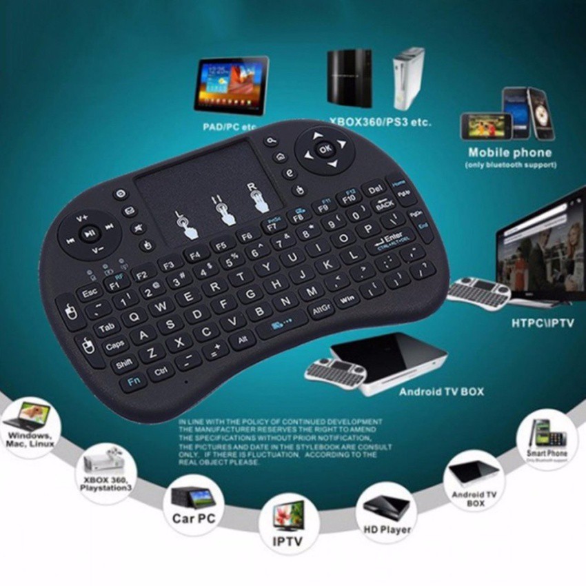 Giới thiệu sản phẩm Bàn phím không dây mini keyboard kiên chuột cảm ứng đa năng.wireless. . . . Phù hợp với Tivi box, chơi game.Chuyên nghiệp cho máy tính hộp truyền hình máy tính bảng và.nhiều mặt hàng khác. .92 phím, bàn phím không dây 2.4GHz. điều khiển không dây từ xa.lên đến 30m.Touchpad thông minh nhạy cảm cao hoạt động dễ.dàng. .Thiết kế thanh lịch nhỏ gọn có thể cầm tay bất cứ.đâu. .Giao diện dễ sử dụng. .Kết nối ko dây bluetooth.Bàn phím không dây.mini 2.4ghz cao cấp i8.Ưu.điểm:.100% Nhãn hiệu mới với chất lượng cao! .Chuyên nghiệp cho máy tính hộp truyền hình máy tính bảng và nhiều.mặt hàng khác. .92 phím, bàn phím không dây 2.4GHz. điều khiển không dây từ xa lên.đến 30m.Touchpad thông minh nhạy cảm cao hoạt động dễ dàng. .Thiết kế thanh lịch nhỏ gọn có thể cầm tay bất cứ.đâu. .Giao diện dễ sử dụng. .Thông số kỹ thuật:.Màu sắc: đen.Phạm vi hoạt động: 30 mét (MAX), mà không xáo trộn tín hiệu và.không có giới hạn chiều. .Truyền tải điện năng: + 5dB Max.điện áp hoạt động: 3.3V.hoạt động hiện tại:Giá JUP